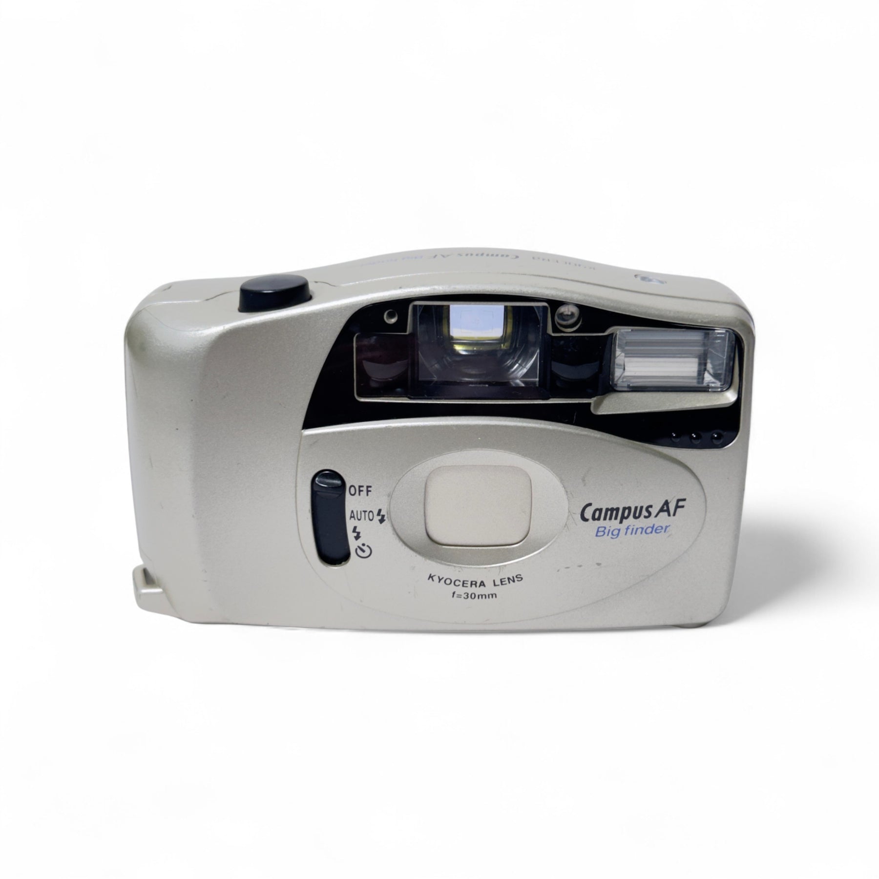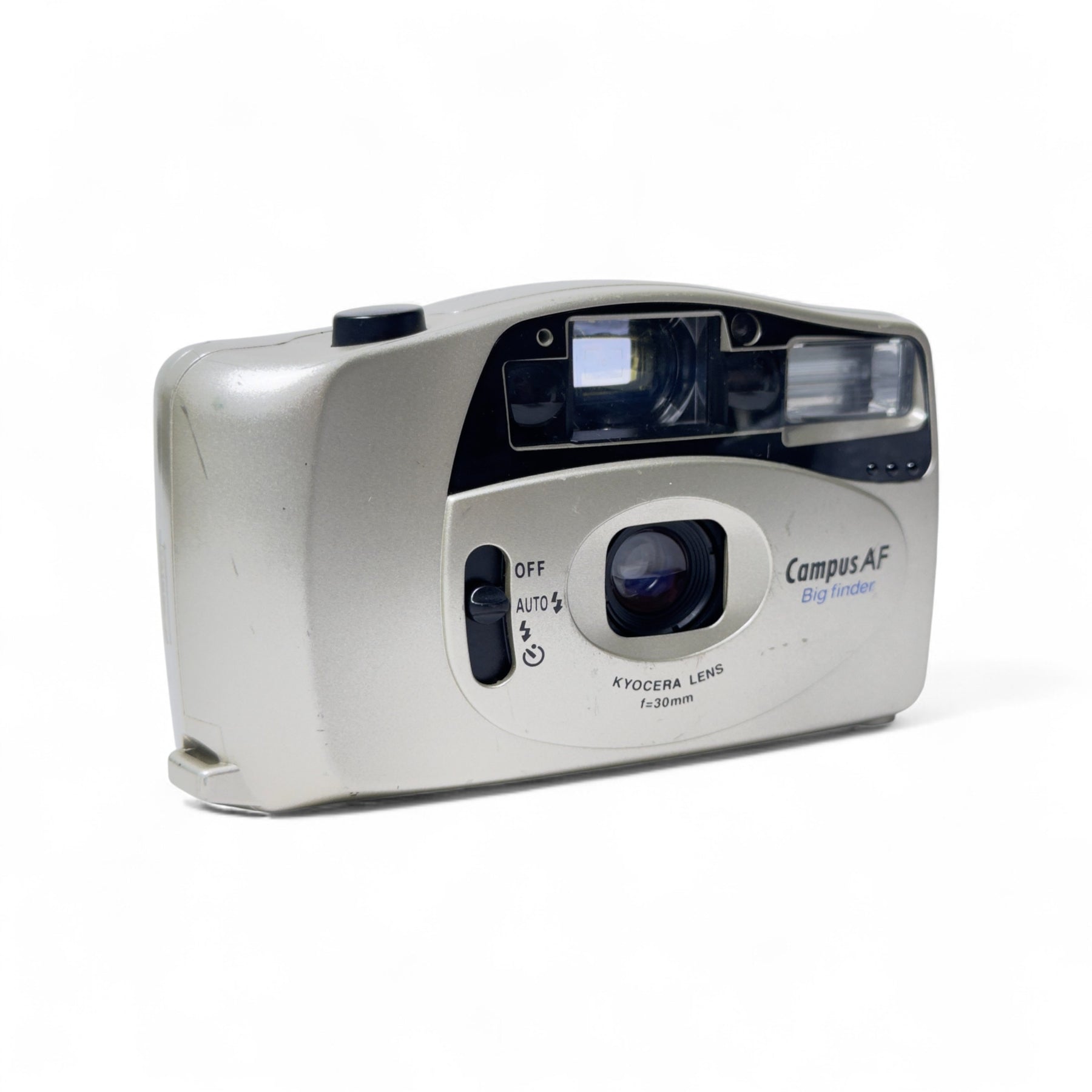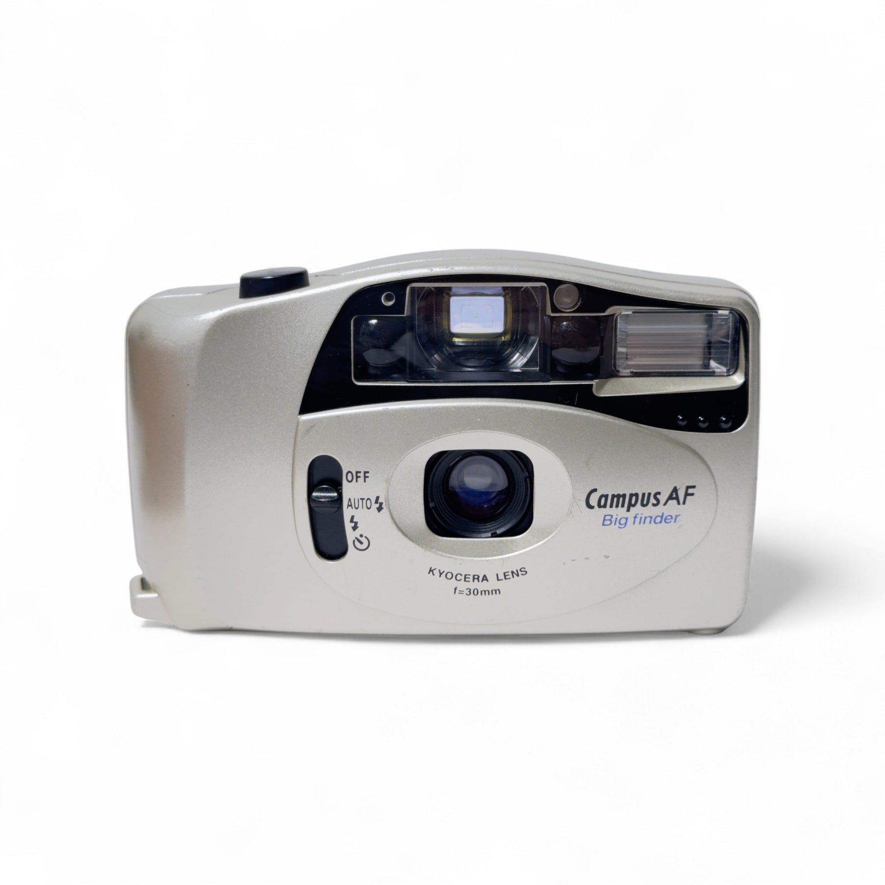 The compact Kyocera Campus AF Big Finder is a fully automatic 35mm point and shoot camera with autowind and rewind, built in flash, self timer and a fixed 30mm lens.