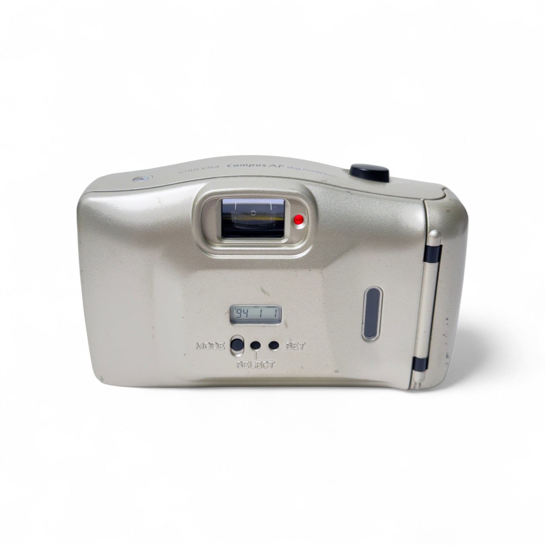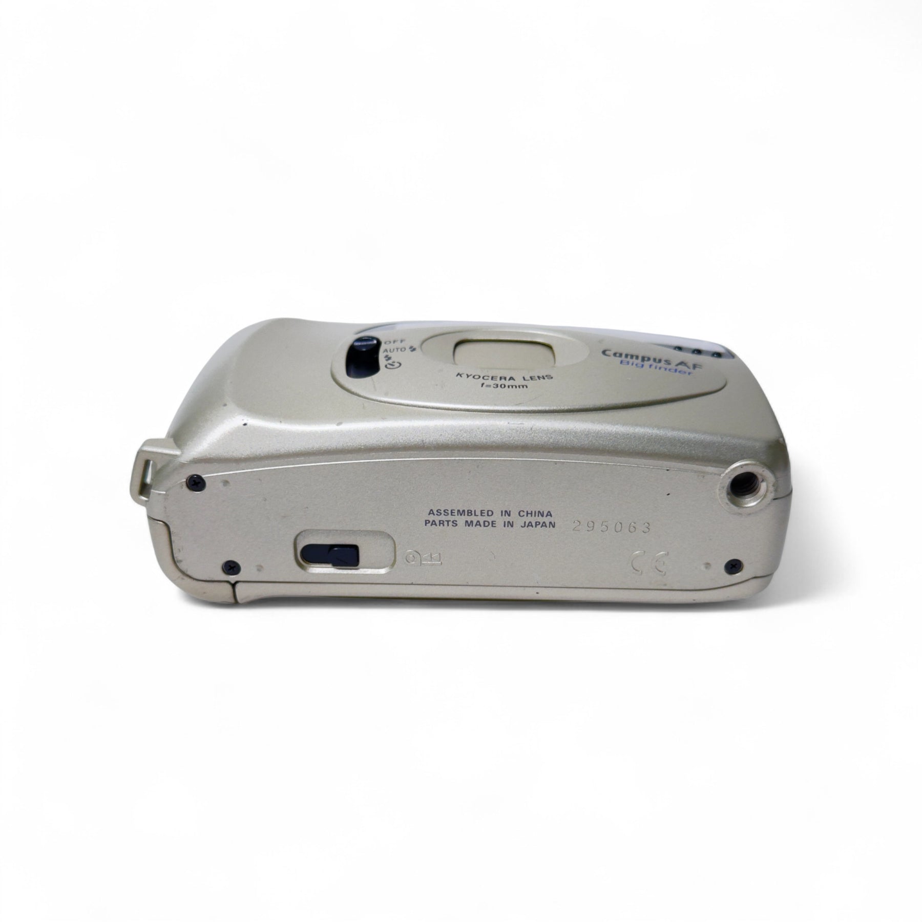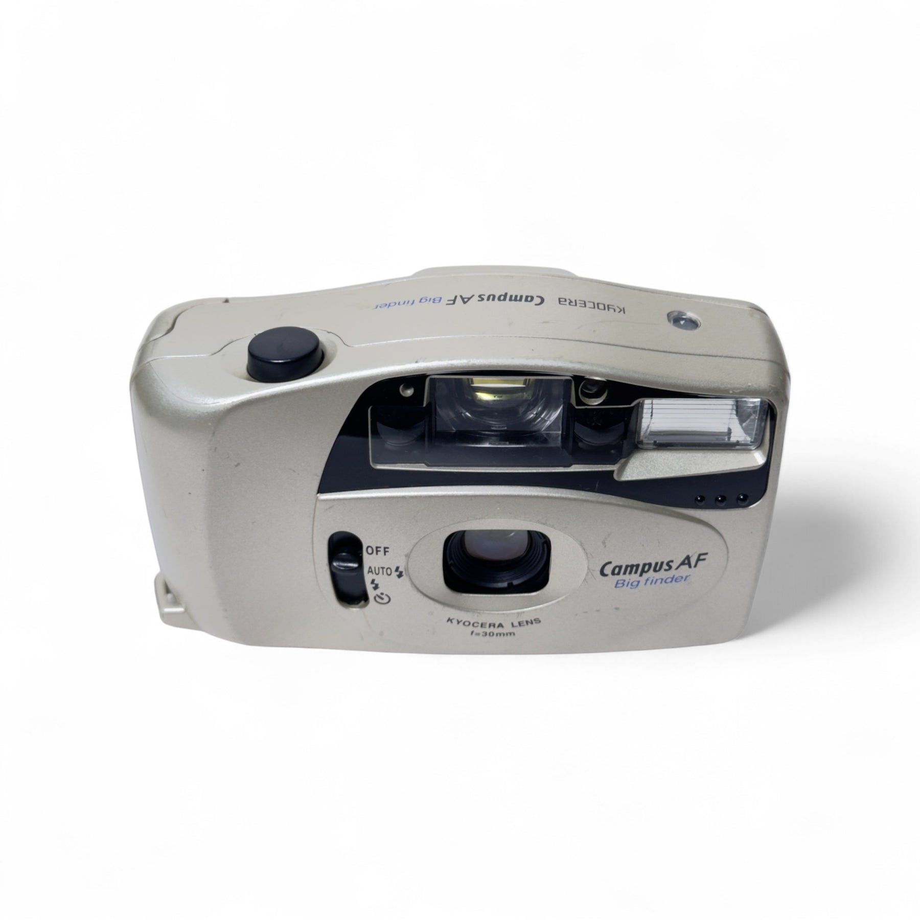 The compact Kyocera Campus AF Big Finder is a fully automatic 35mm point and shoot camera with autowind and rewind, built in flash, self timer and a fixed 30mm lens.