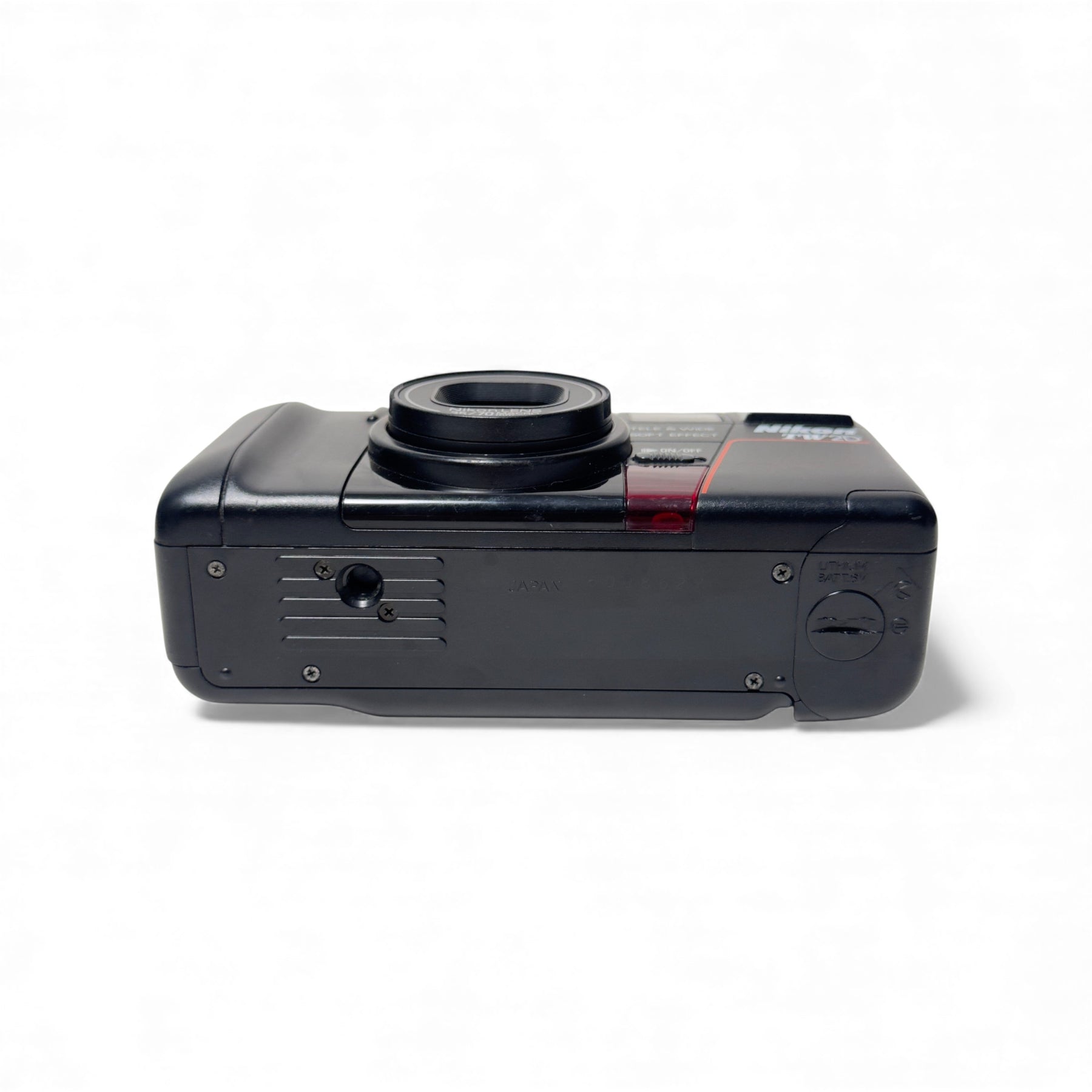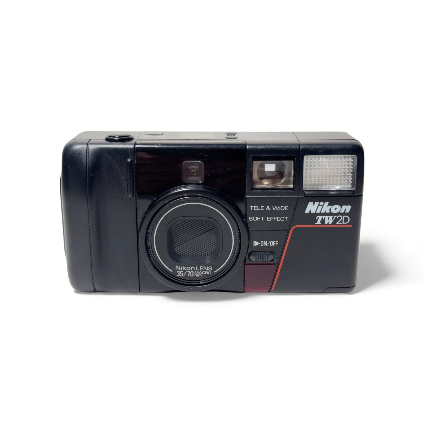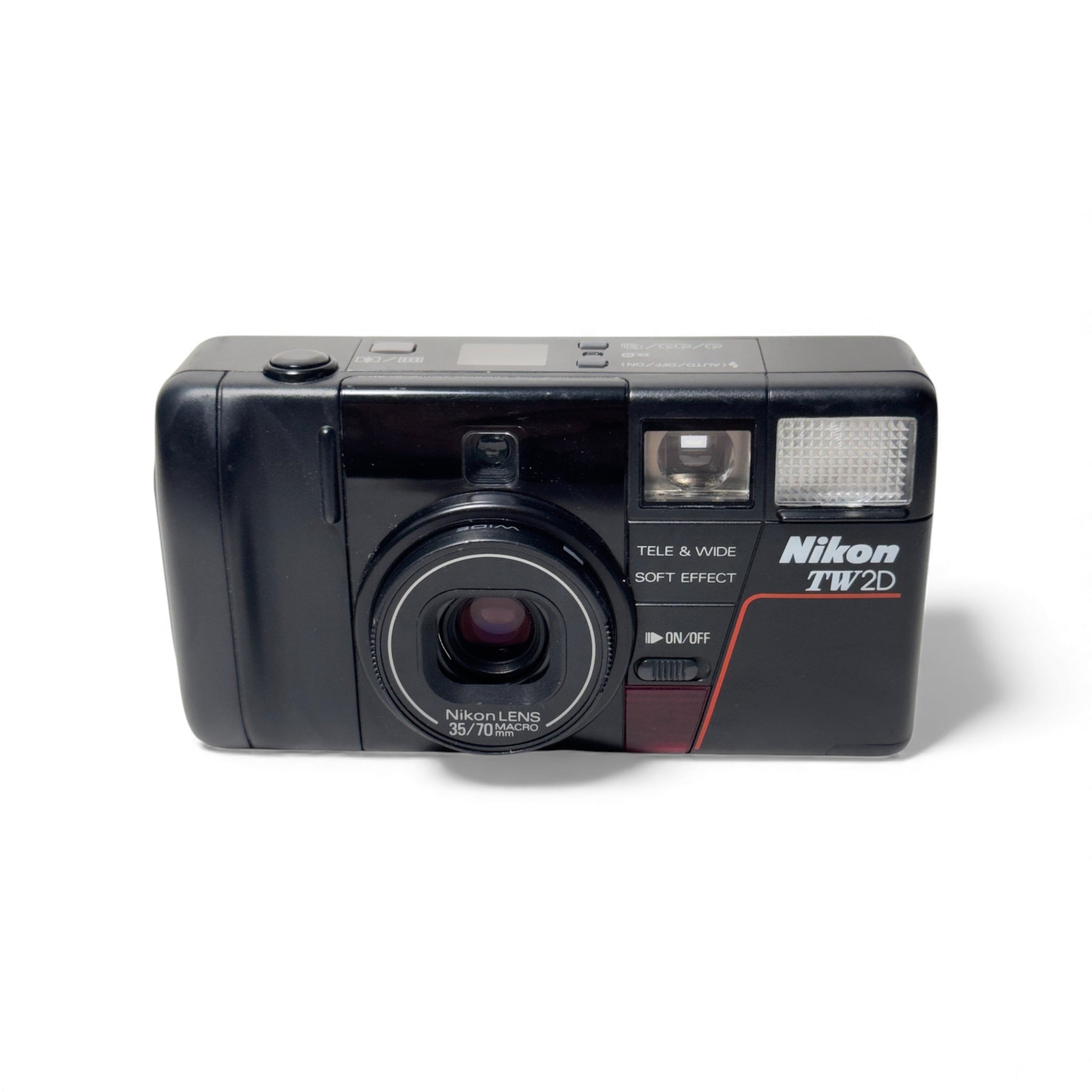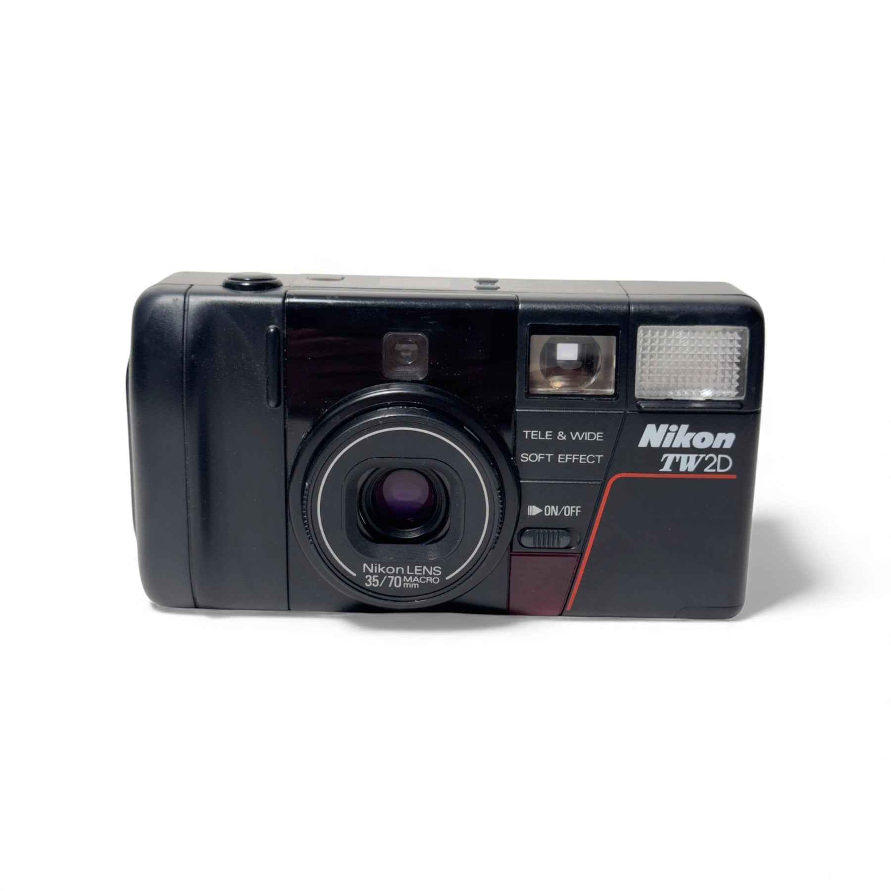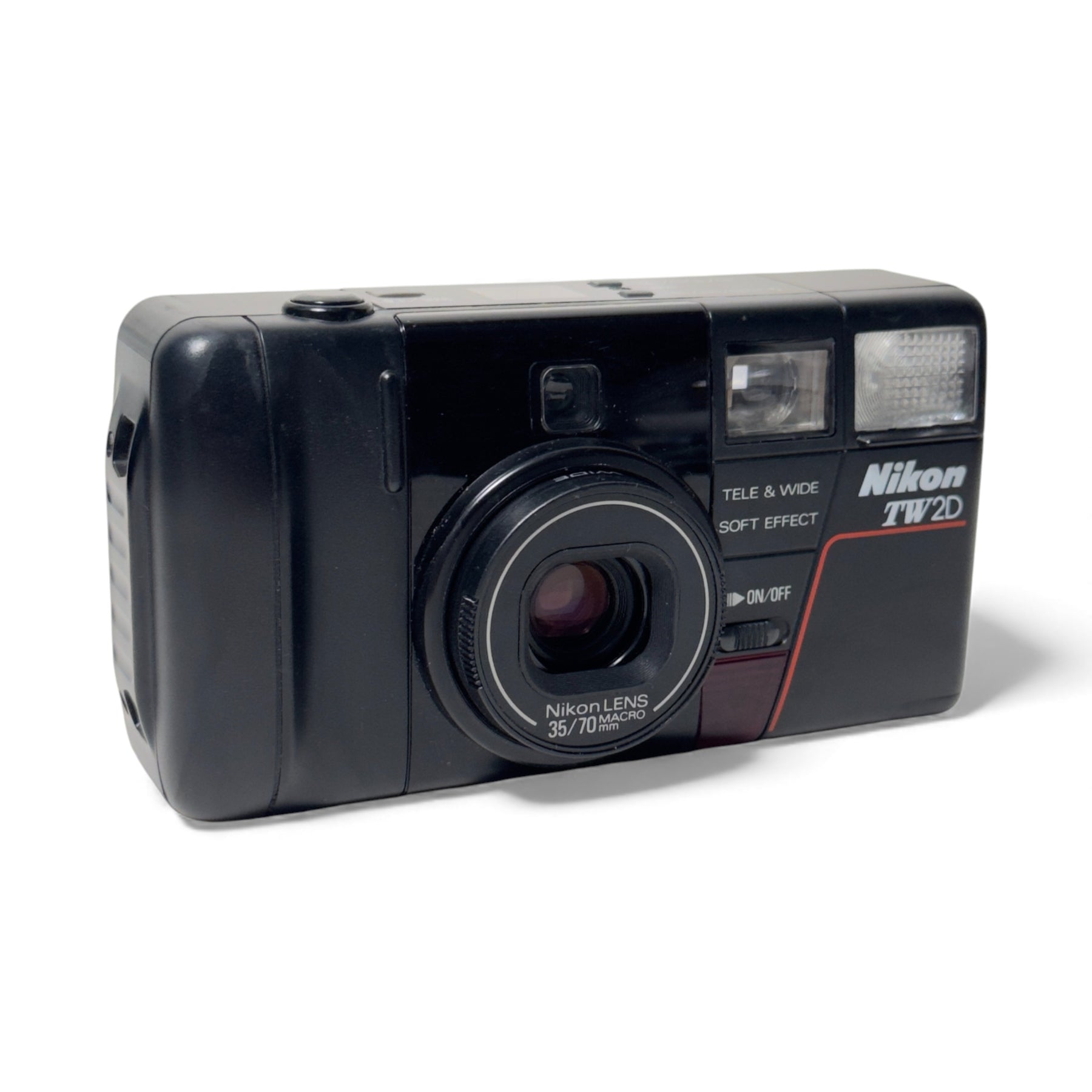 The Nikon TW2D is a fully automatic 35mm point and shoot camera with autowind and rewind, a built in flash, a self timer and 35-70mm f/3.5-6.8 lens. At the time, it was the world's thinnest dual-lens, AF compact.
