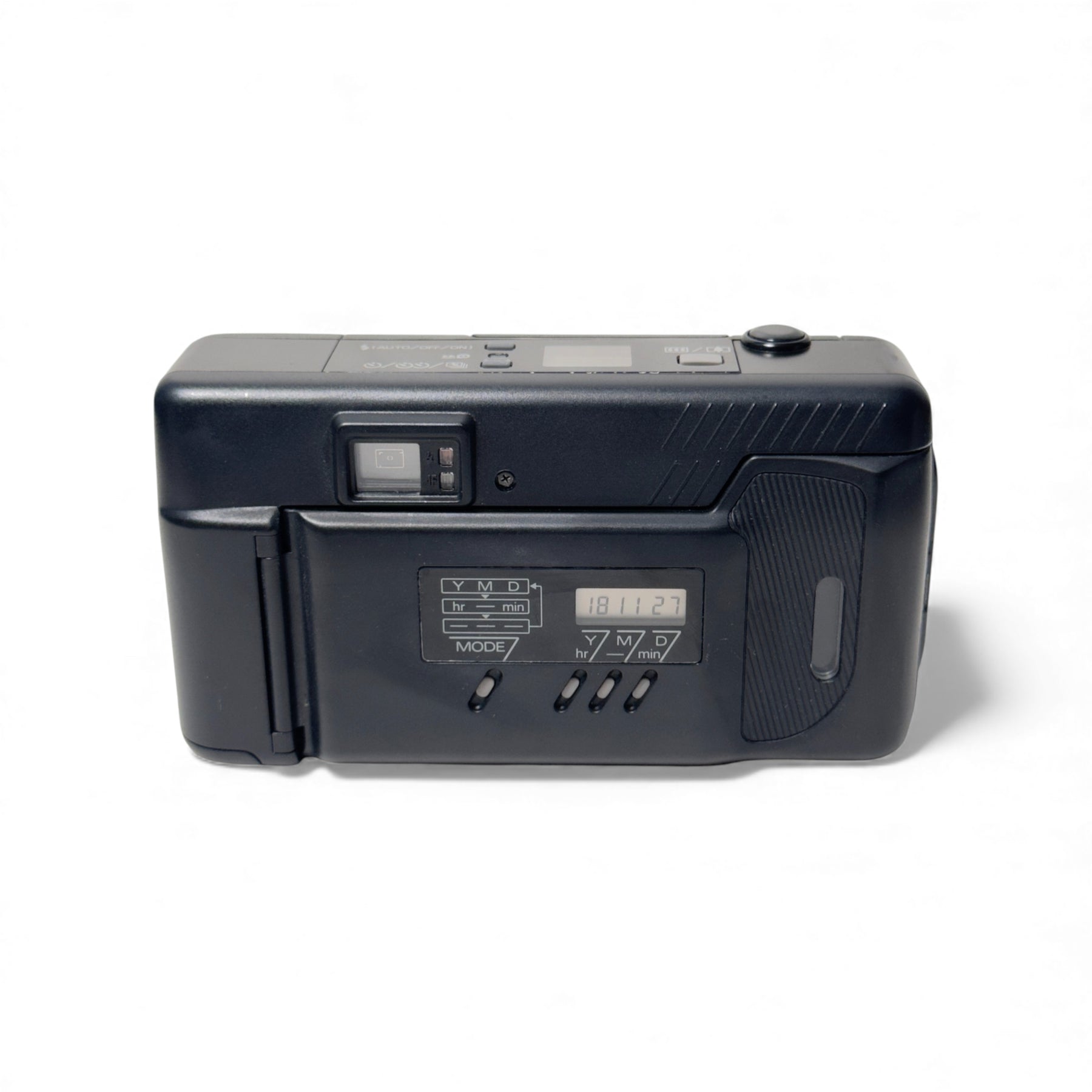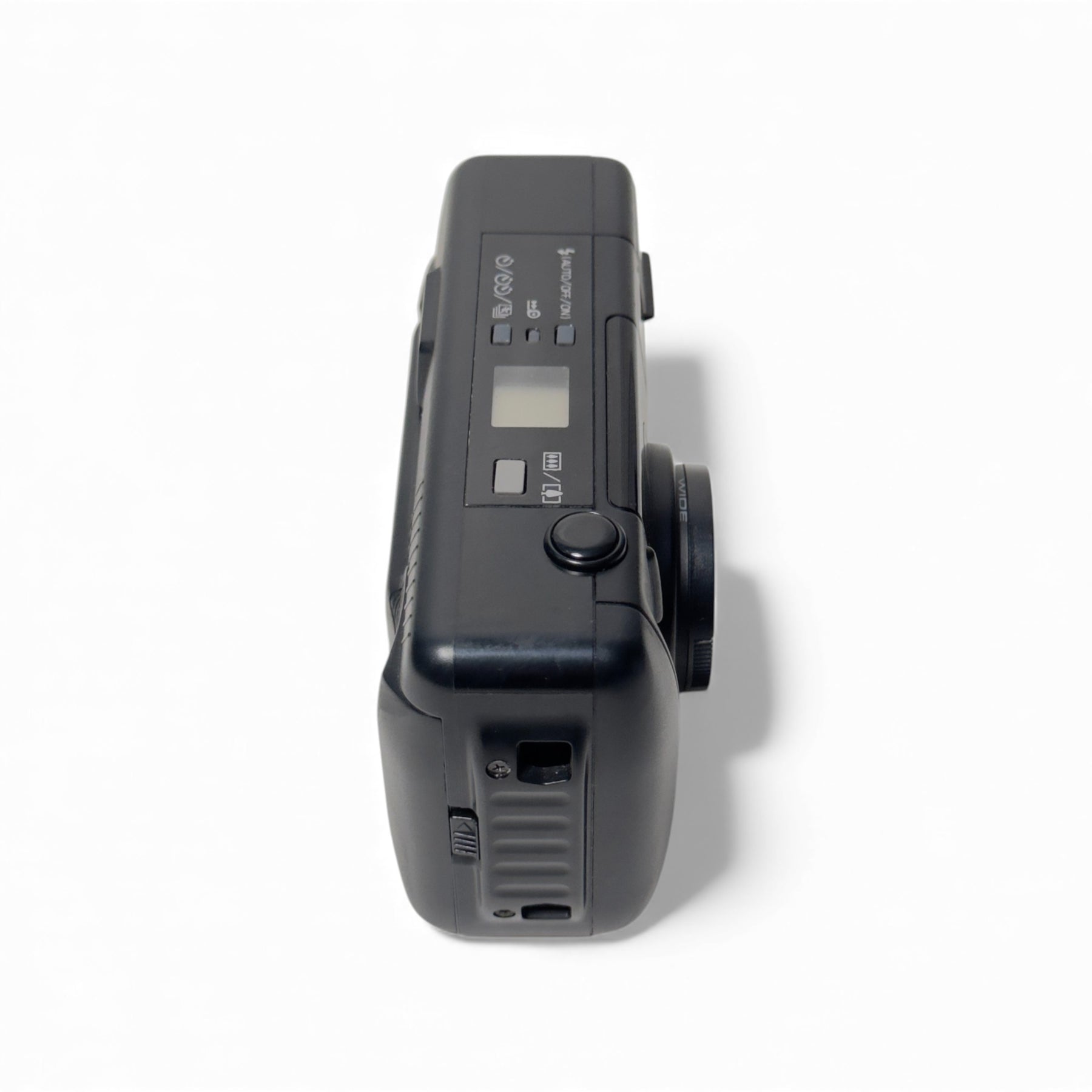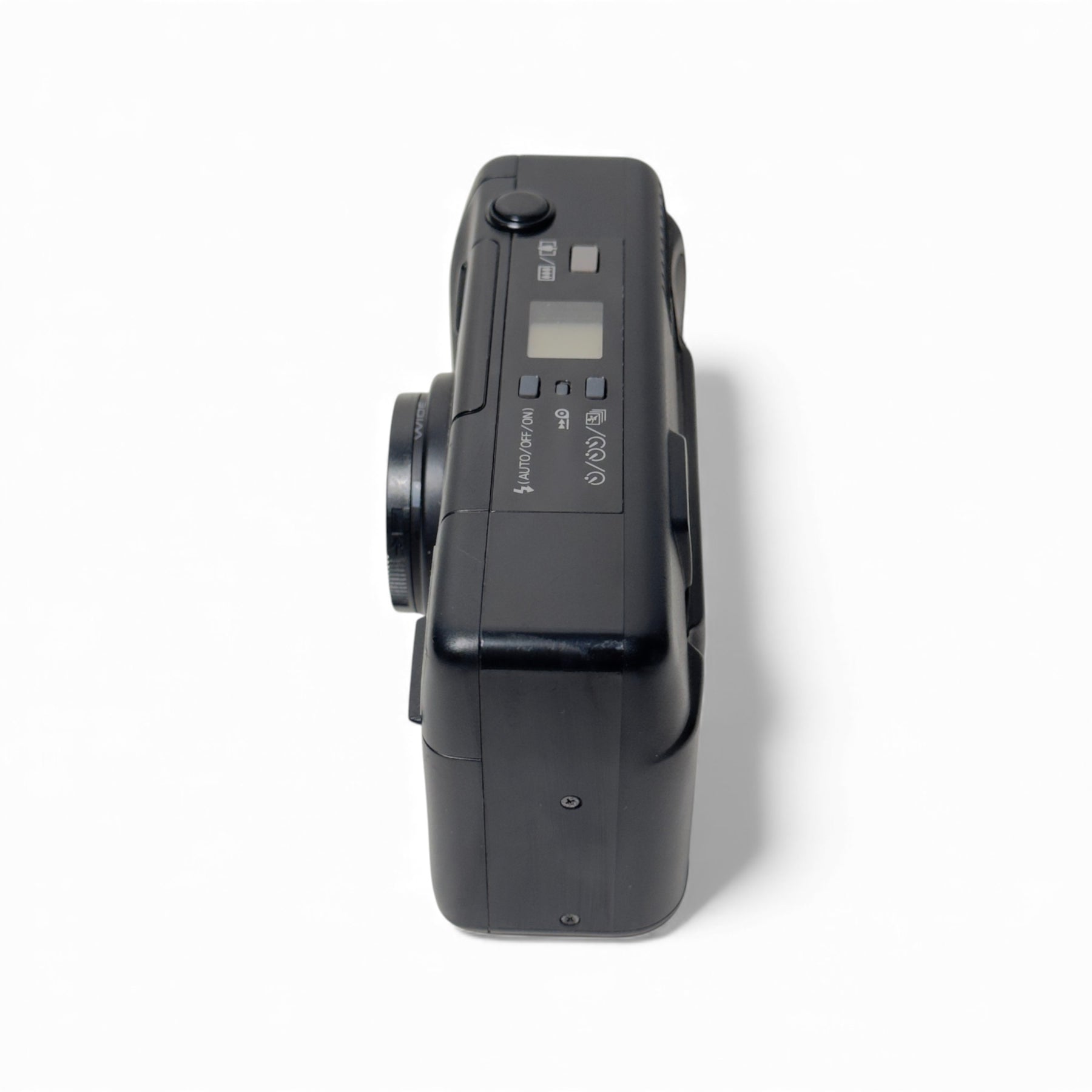 The closest focusing distance for this lens is 0.69m and accepts film with an ISO range from 64 to 1600. The screen displays the battery status, frame count and different modes of flash. Equipped with automatic film advance, self-timer mode and red-eye reduction, the point and shoot is ideal for beginner film users.